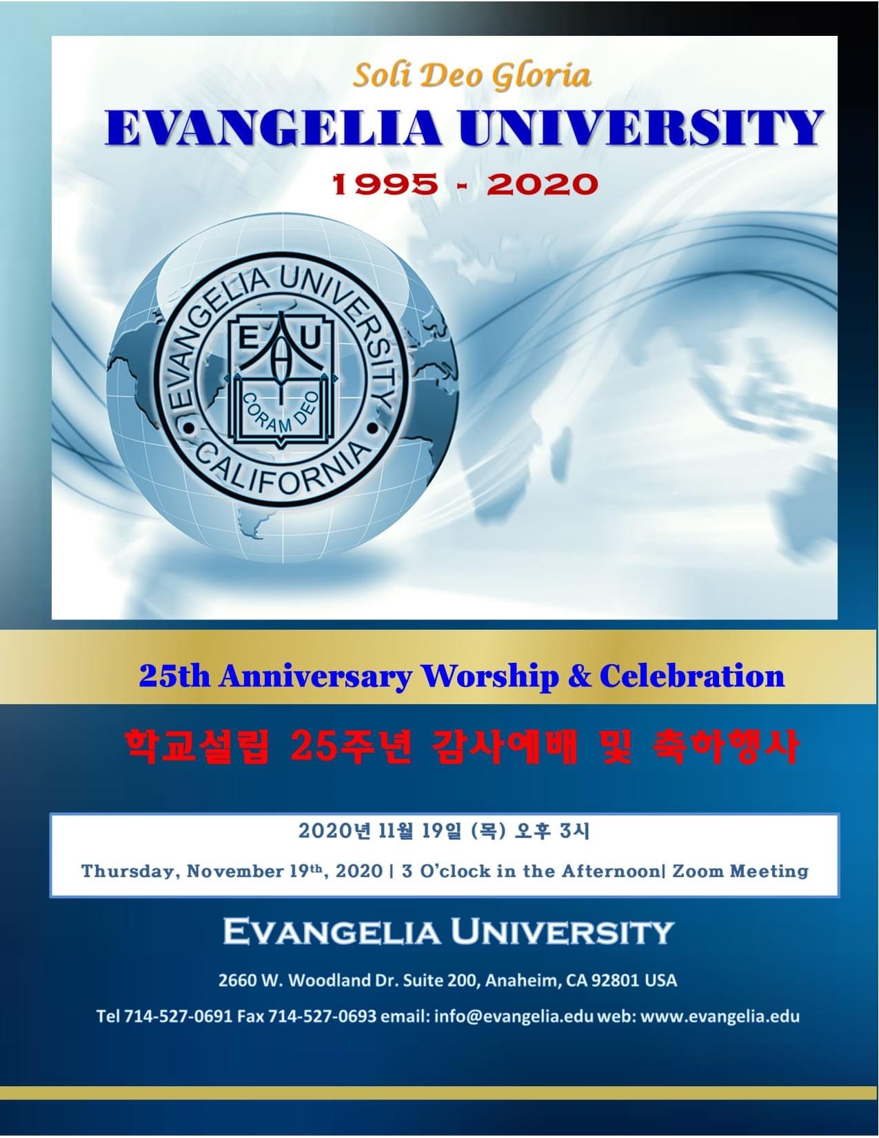Evangelia University is inviting you to a scheduled Zoom meeting. Topic: 25th Anniversary worship & Celebration 25주년 감사예배와 축하행사 Time: Nov 19, 2020 03:00 PM Pacific Time (US and Canada) Join Zoom Meeting https://us02web.zoom.us/j/82779790726?pwd=b0RnOGhjaDJxZjdDbUVnVzZPMFlDUT09 Meeting ID: 827 7979 0726 Passcode: …